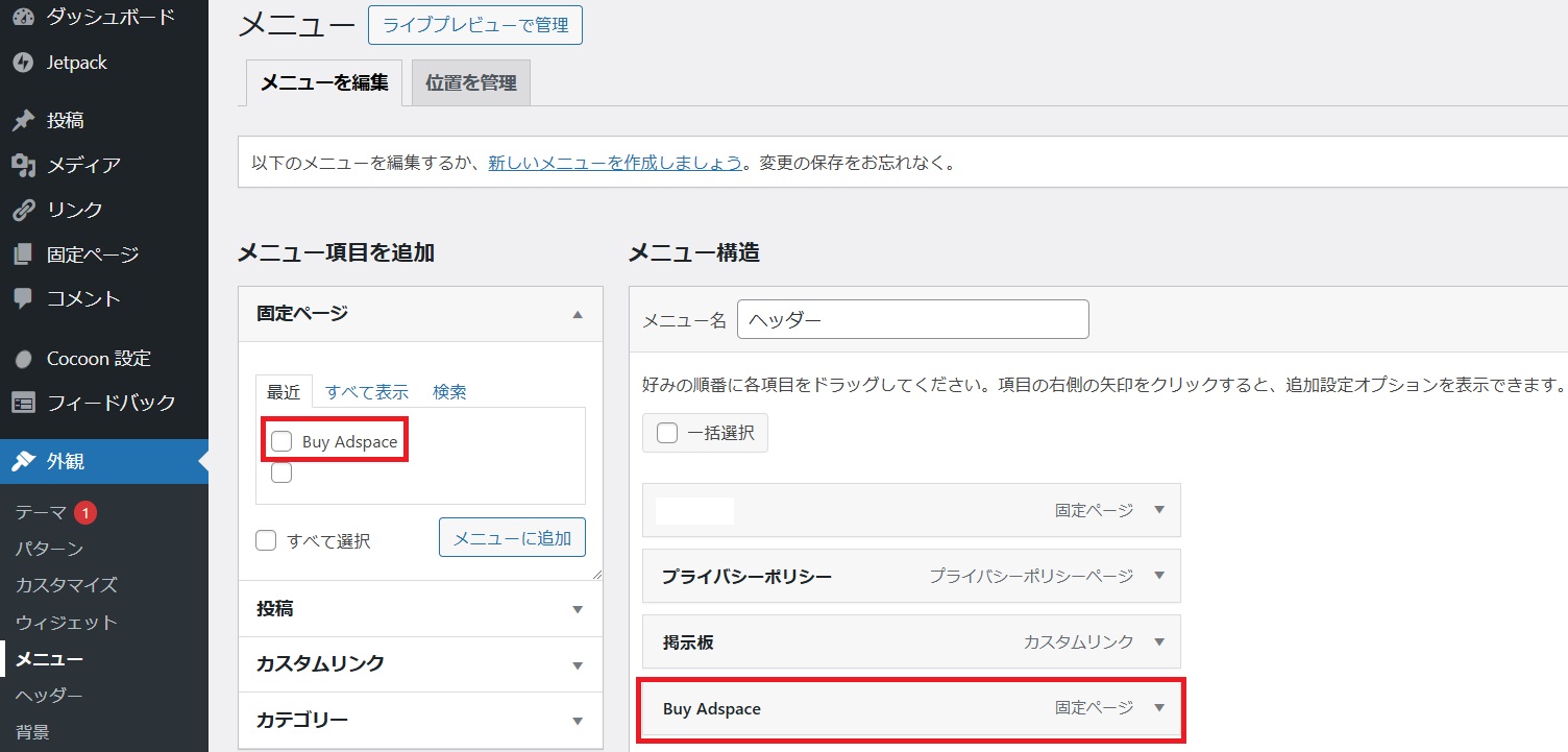 Buy Adspace がヘッダーメニュー(ヘッダーバー)に追加された方へ