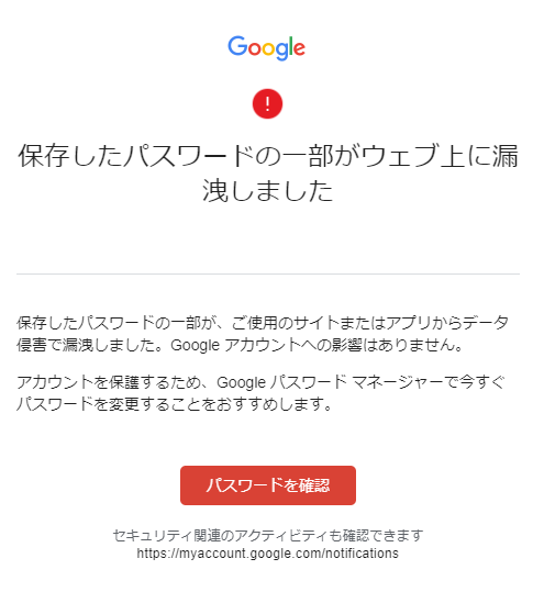 保存したパスワードの一部が、ご使用のサイトまたはアプリからデータ侵害で漏洩しました。Google アカウントへの影響はありません。