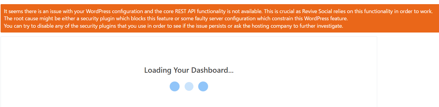 It seems there is an issue with your WordPress configuration and the core REST API functionality is not available. This is crucial as Revive Social relies on this functionality in order to work. The root cause might be either a security plugin which blocks this feature or some faulty server configuration which constrain this WordPress feature. You can try to disable any of the security plugins that you use in order to see if the issue persists or ask the hosting company to further investigate.